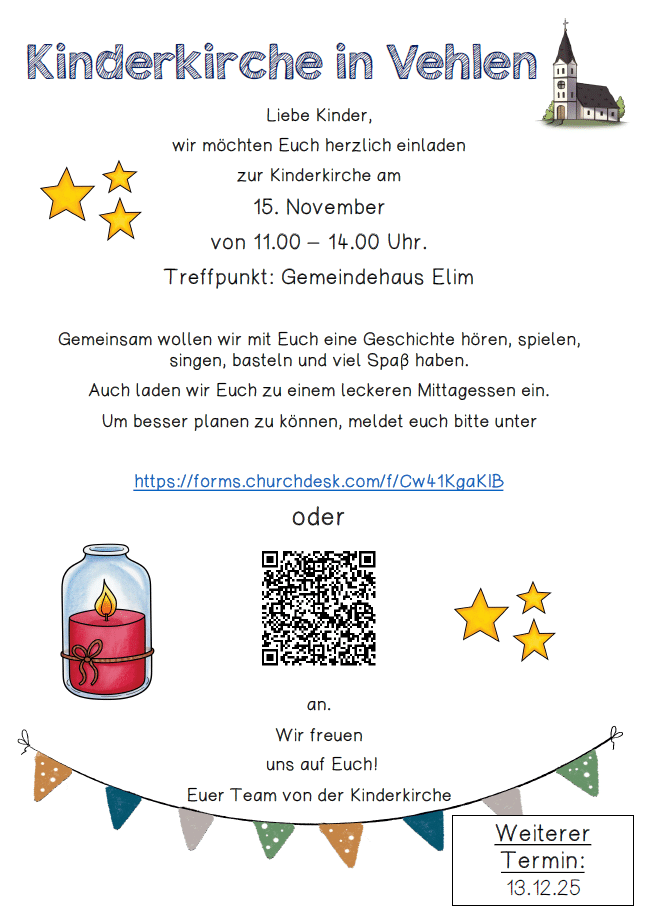 wir möchten Euch herzlich einladen zur Kinderkirche am 15. November von 11.00 – 14.00 Uhr.