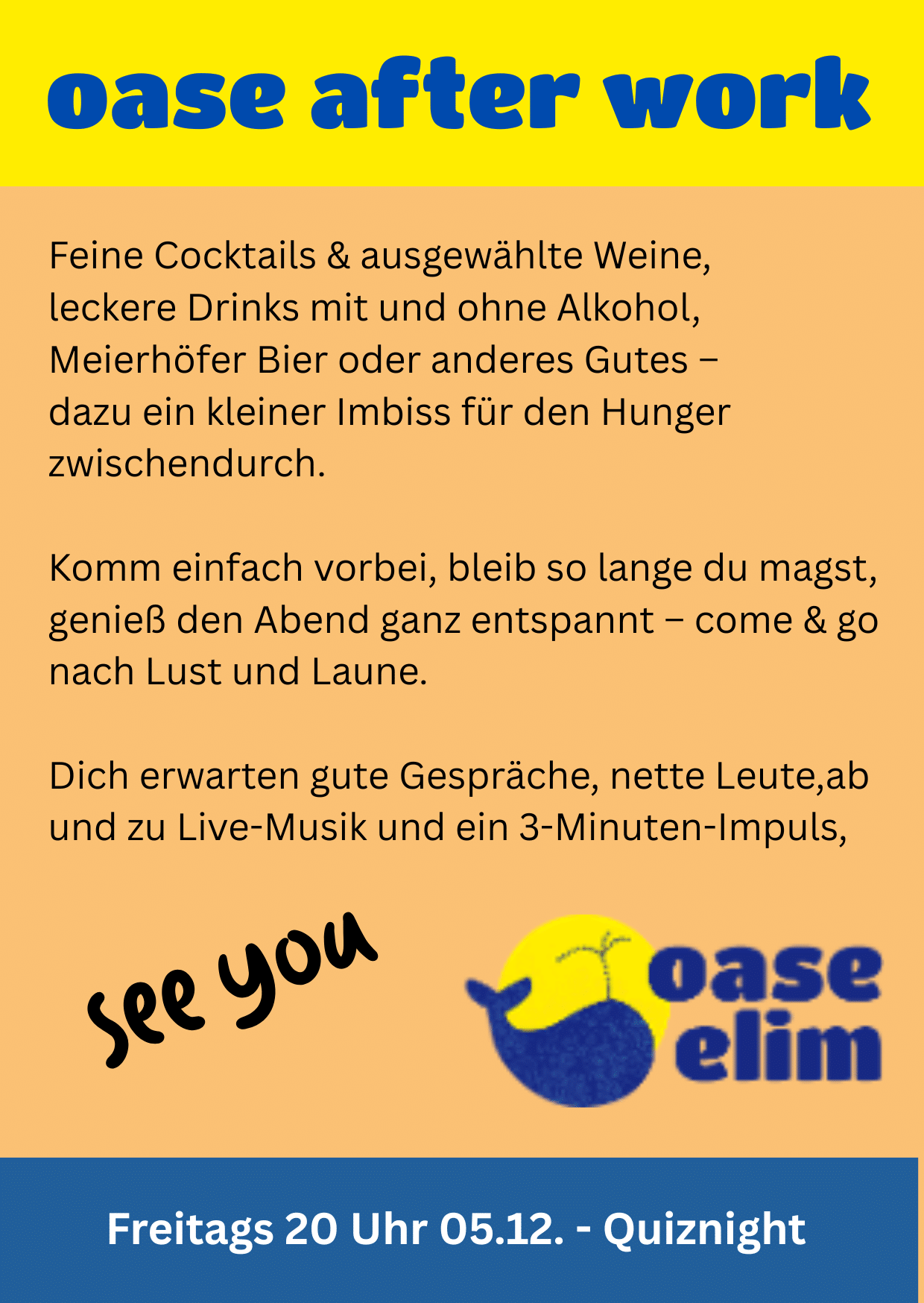 Freitag, den 5. Dezember ab 20 Uhr – Oase After Work Quiz Night Oase After Work – Freitag, den 09. Mai ab 20 Uhr. Es wird lecker: ….. Cocktails: ….. Herzlich willkommen!