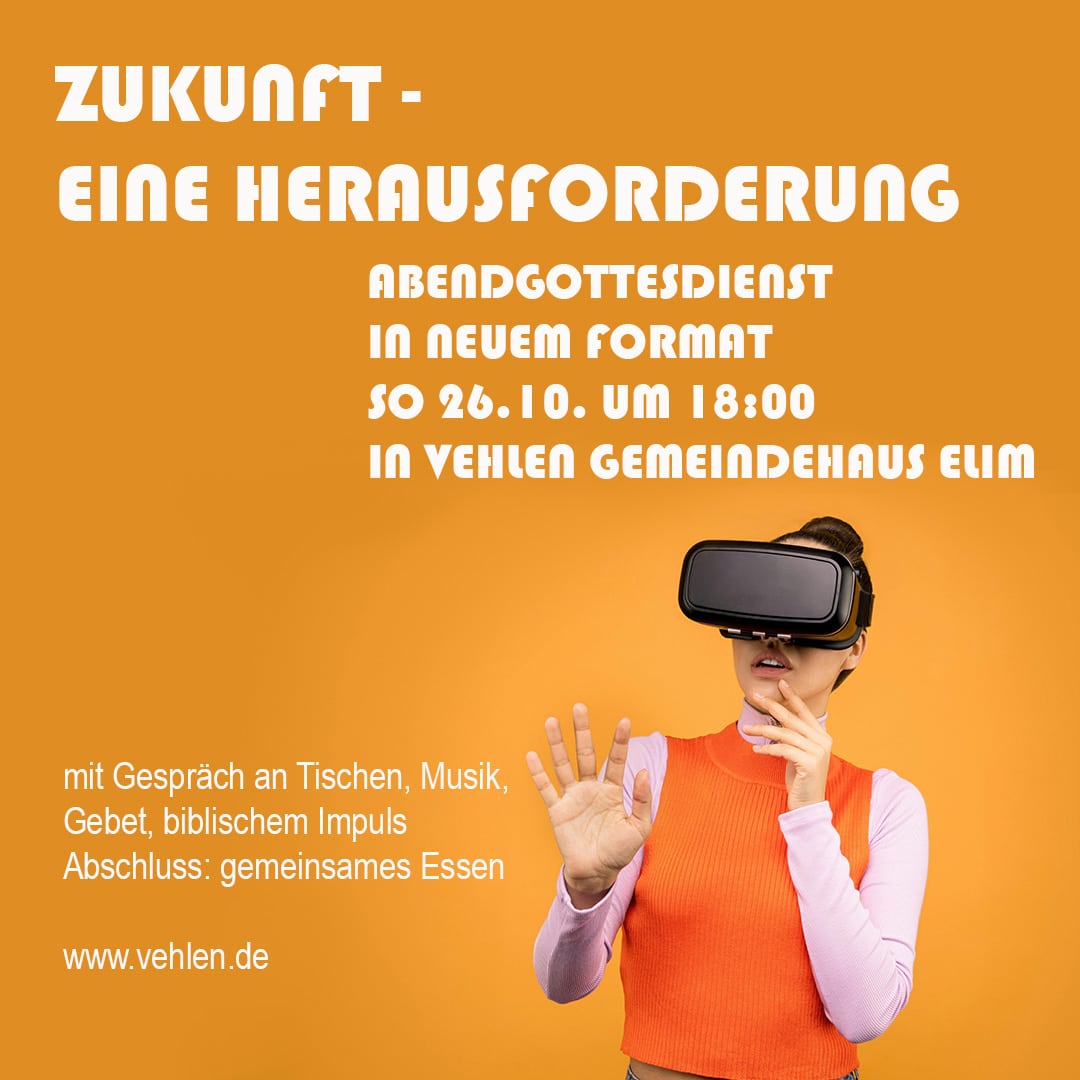 Sonntag, 26. Oktober, 18.00 Uhr Abendgottesdienst im Gemeindehaus Oase Elim mit anschließendem Essen / Thema: Zukunft - eine Herausforderung